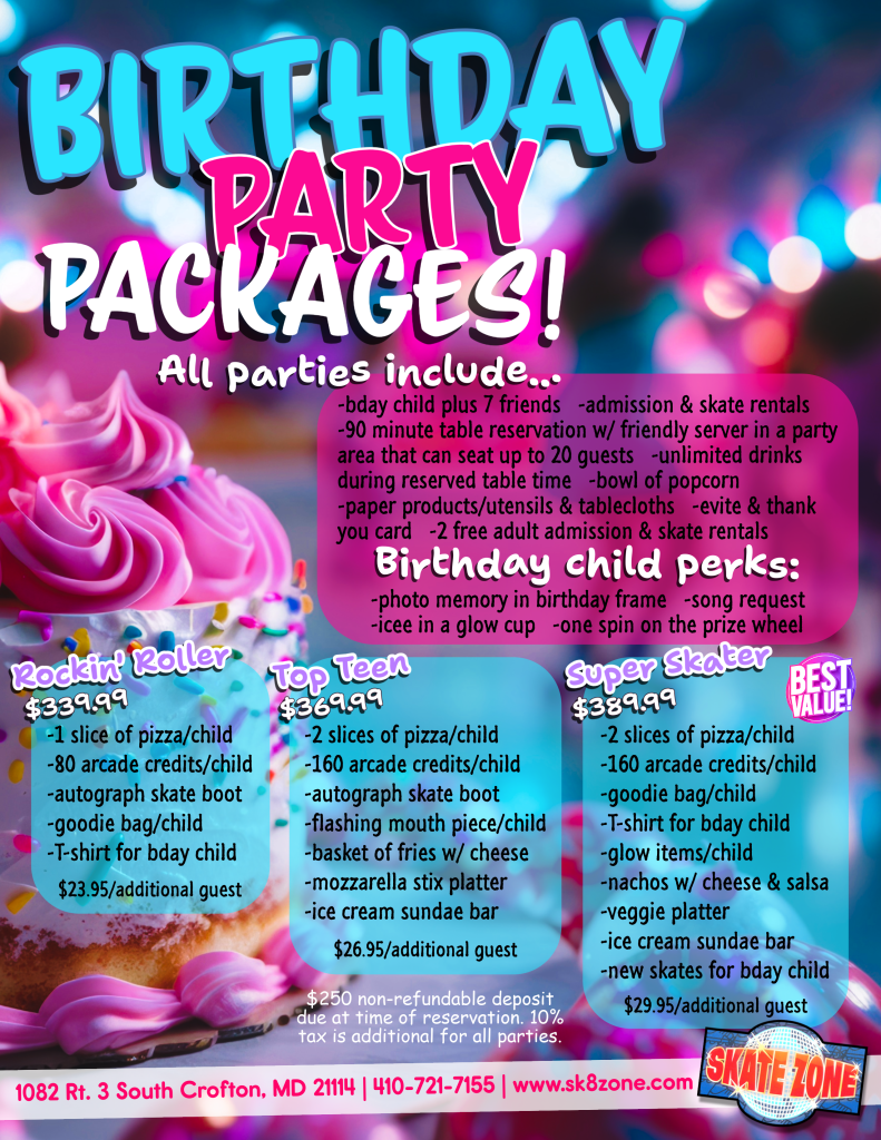 NOTE: Any public session party scheduled after Wednesday for the upcoming weekend will be subject to a late fee of $25.00. No outside food or drinks allowed with the exception of cake/cupcakes only if you have a scheduled birthday party. Your party is subject to a 10% sales/amusement tax. All children in the party zone must be wearing a party wristband.