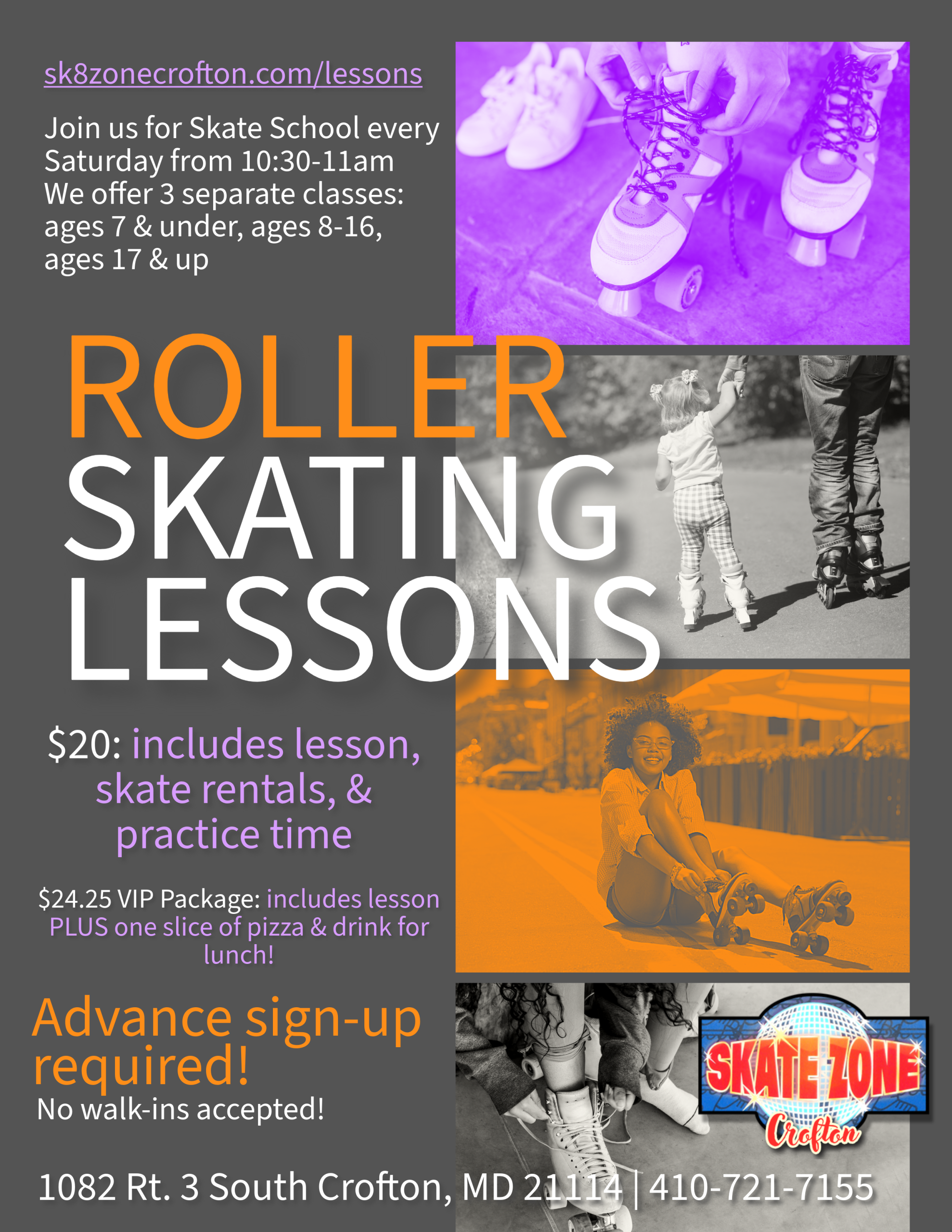 Join us on Saturday mornings from 10:30-11am for our skate school! This is a beginner lesson (for a more advanced lesson check out the private option below). We welcome all ages, divided into 3 groups! Advance reservations are required, sign up here!