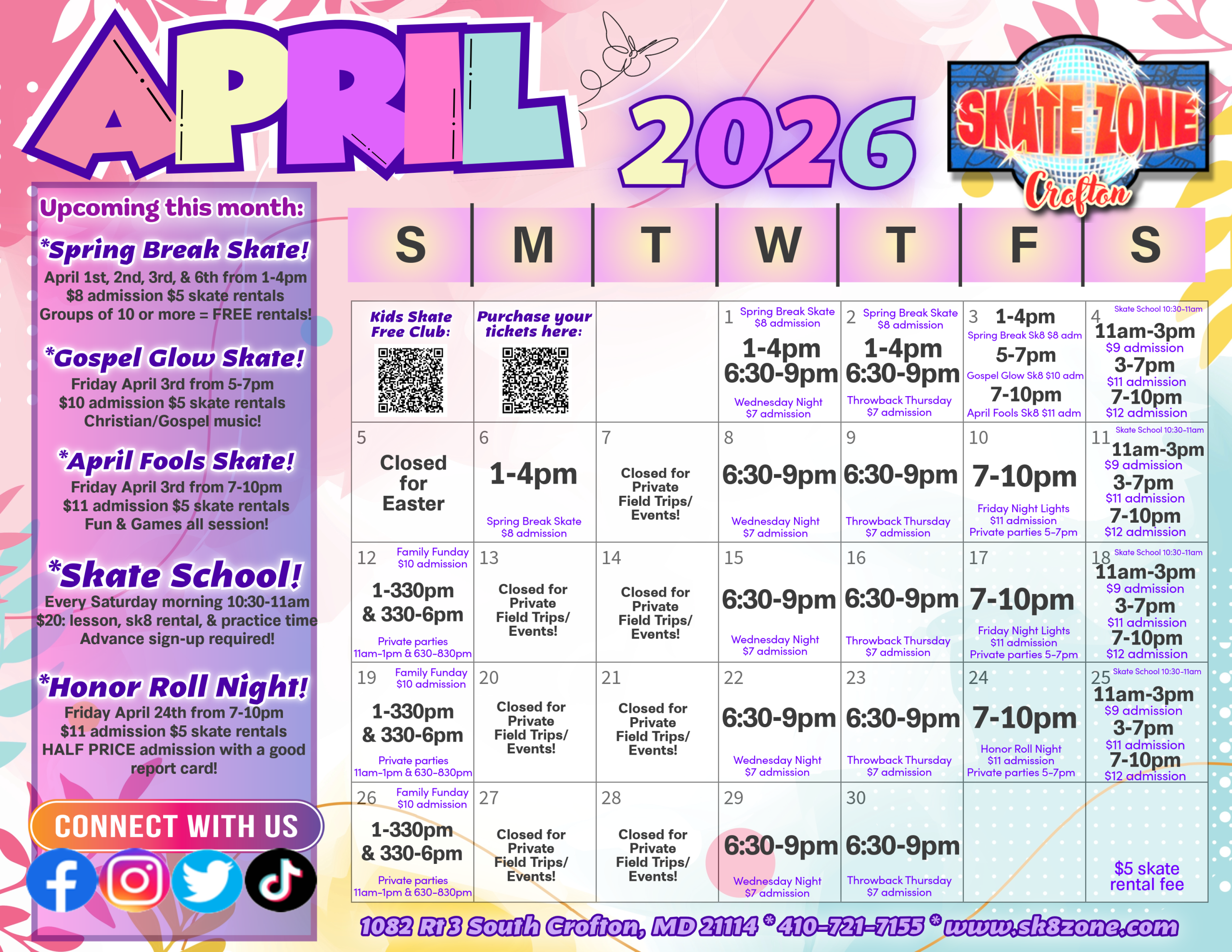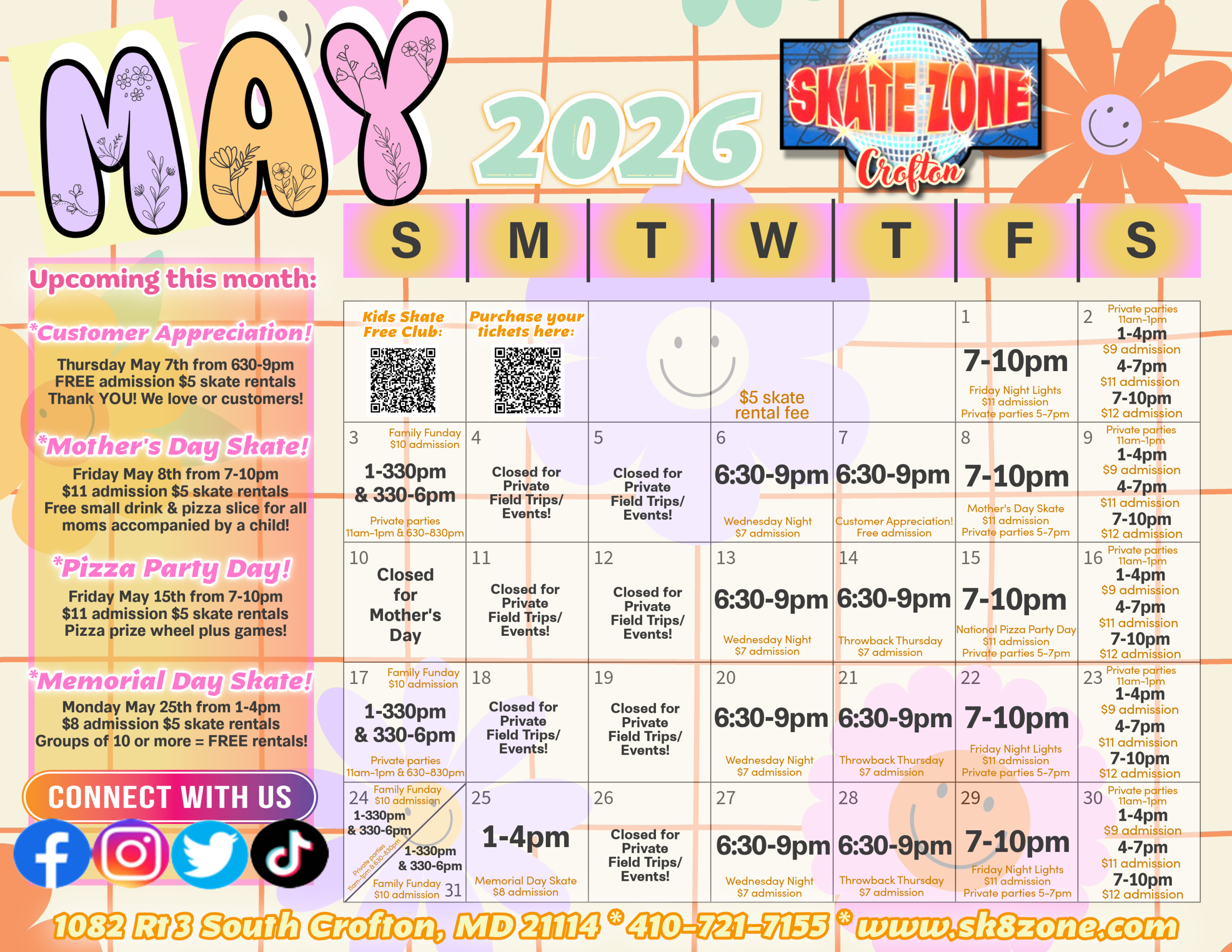 Schedule / Tickets / Special Events Purchase your admissions/skate rentals for any session here! April Calendar May Calendar Special Events Reserve your spot for Customer Appreciation here! Get your Mother’s Day Skate tickets here! Get your National Pizza Party Day tickets here!